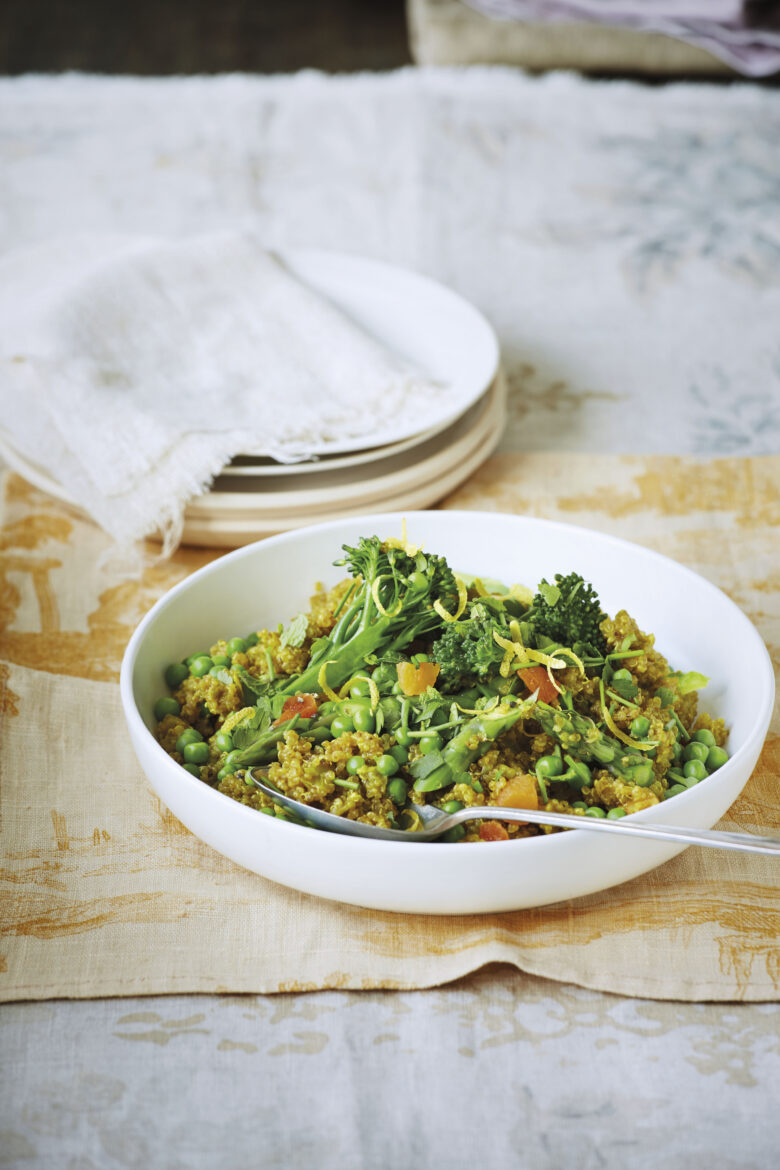 Die Quinoa in den Topf geben und etwa 1 Minute rühren, um die Körner anzurösten. Den Safran in 750 ml Brühe krümeln und die Brühe in den Topf geben. Zum Köcheln bringen, dann abdecken und 8 Minuten köcheln lassen, bis die Körner fast gar sind und die Brühe größtenteils aufgenommen haben.