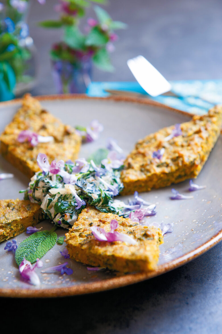Brennesselblätter fein schneiden und mit allen übrigen Zutaten in einer großen Schüssel vermischen. Zuletzt das Vollkornmehl beimengen, sodass ein gut streichbarer Teig entsteht. Masse auf einem mit Backpapier ausgelegtem Blech verteilen und im Backofen bei 200°C ca. 30 Minuten bei Ober-/Unterhitze backen. Noch warm in kleine Rauten schneiden. Passt warm und kalt zu Brennesselspinat.